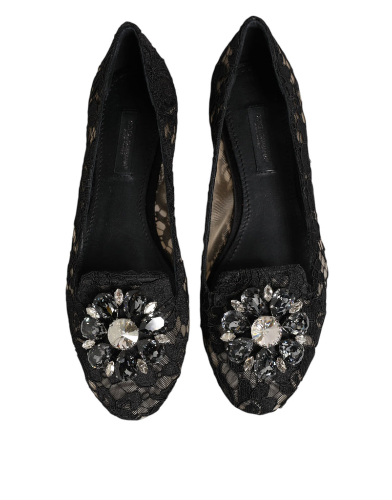 Gorgeous brand new, 100% Authentic Dolce & Gabbana elegant Vally shoes are exquisitely crafted in Italy from the finest Taormina lace. Seen here in dark blue, these pretty floral lace Vally slippers from Dolce & Gabbana will instantly lift your look to new sartorial heights. Featuring an almond toe, a branded leather insole and a wearable flat leather sole, these beauties are finished with a sparkling decorative crystal flower on the front.