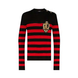 Balmain red and black striped jersey. Button fastening at left shoulder. Iconic gold fabric logo on the front.