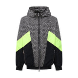 Elevate your outerwear with this striking Balmain nylon jacket, showcasing a bold geometric pattern print that commands attention. Neon yellow stripes race down the sides and sleeves, adding a vibrant pop of color. Function meets high fashion with a front zip fastening, hood with drawstring, and secure front zip pockets – all designed to keep you stylishly protected against the elements. Crafted with precision, it’s a testament to Balmain’s commitment to luxury and cutting-edge design.
