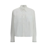 Brunello Cucinelli’s cotton Shirt is a sophisticated and contemporary piece. It features a classic collar and front button closure, ideal for an elegant yet versatile look. The two patch welt pockets on the front offer a practical and elegant touch, while the adjustable button cuffs, embellished with iconic appliqué shiny jewels, add an understated luxury detail. The curved hem and oversized fit give a relaxed, modern look perfect for creating a casual-chic, stylish and fashionable look.