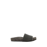Sandals by Brunello Cucinelli, flat sole, round toe, wide band on the front covered with the brand’s iconic jewels, suede sole design, press-stamped logo insole.