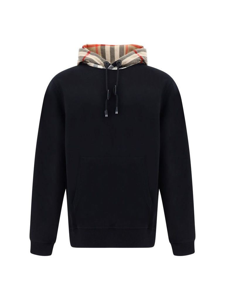Discover the epitome of comfort infused with the quintessential touch of luxury with this Burberry Samuel Hoodie. Tailored to exude style, this hoodie features a drawstring hood for a personalized fit and is accented with the brand’s iconic Archivio Check pattern on the contrasting hood, adding a unique twist to your casual look. With snug ribbed cuffs and hem as well as a convenient front kangaroo pocket, this black hoodie ensures an oversized fit that’s perfect for a relaxed, yet sophisticated silhouette. Designed in Italy, this piece is not just a hoodie, but a statement of timeless fashion.