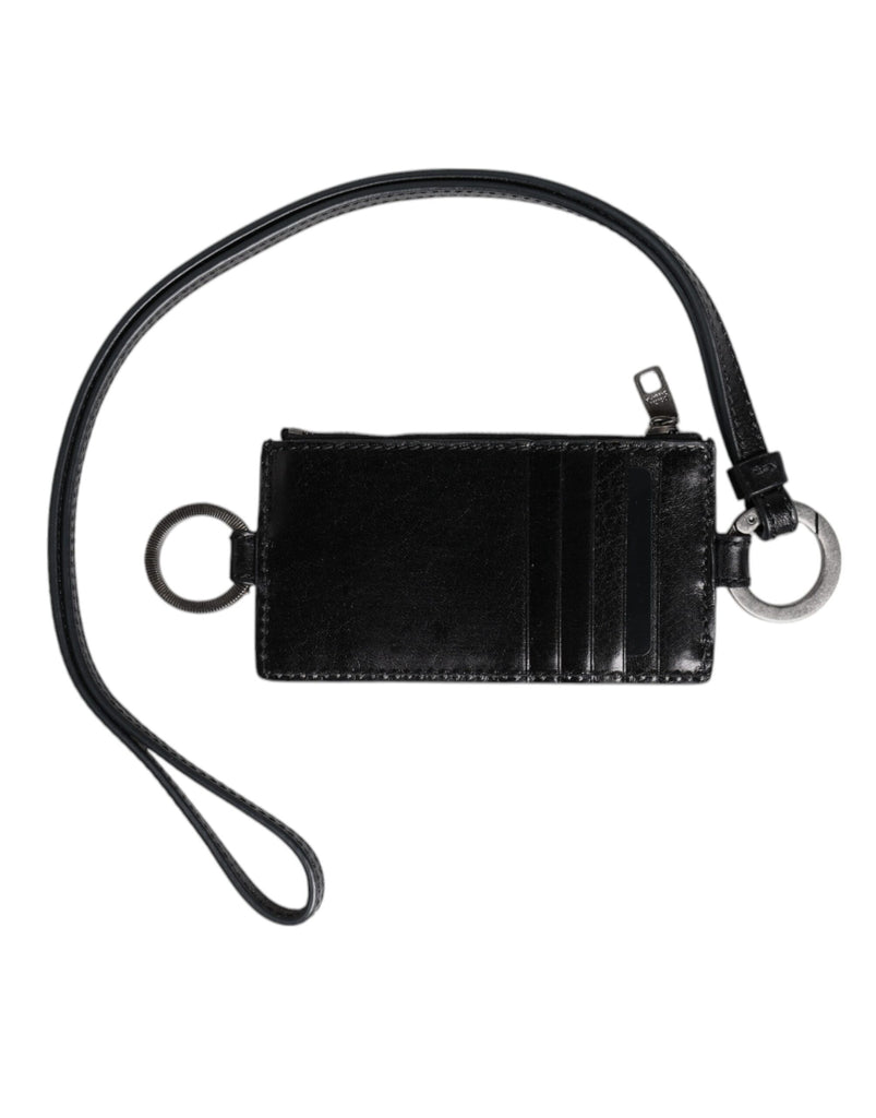 Dolce & Gabbana Black Leather Logo Embossed Lanyard Card Holder Wallet