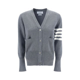 Merino Wool Cardigan by Thom Browne, contrasting button front closure, open front pockets, V-neck on front, contrasting iconic brand bands on arm, ribbed hem, ribbed cuffs.