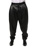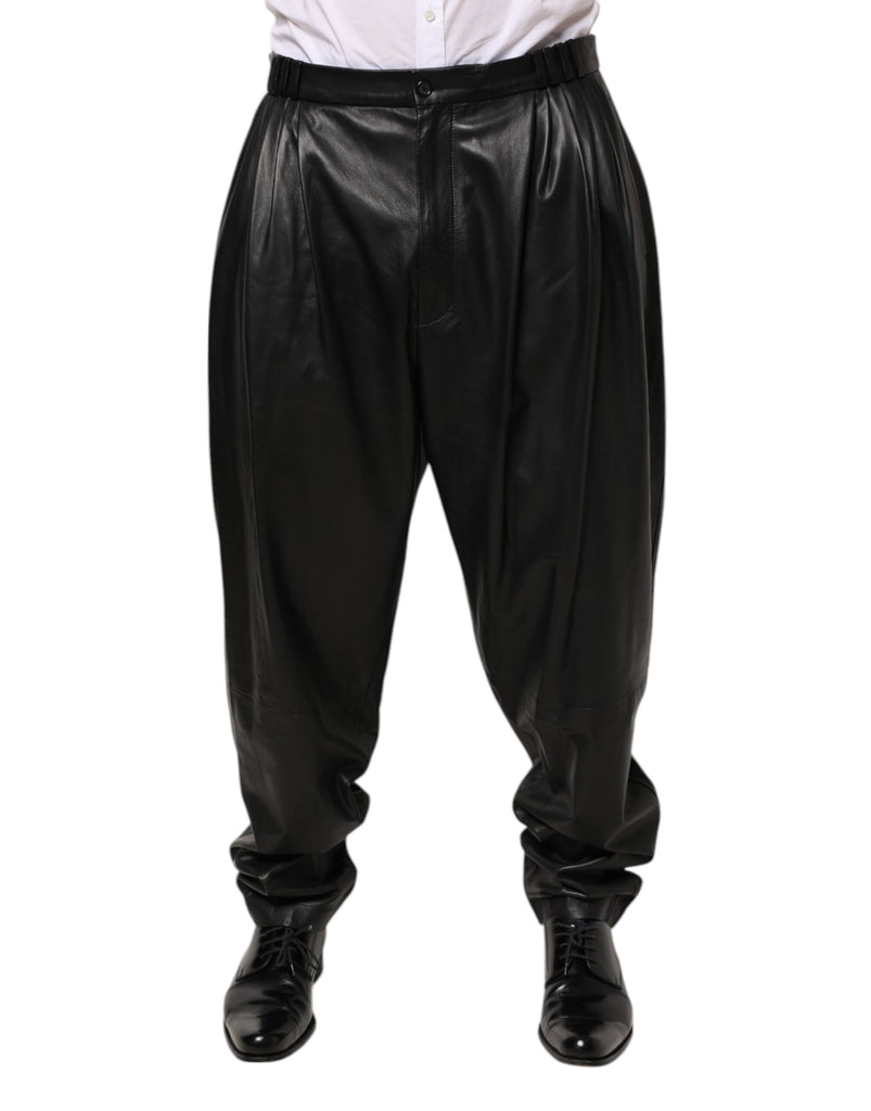 Gorgeous brand new, 100% Authentic Dolce & Gabbana lamb leather trousers for men. These luxurious pants are crafted from supple black lambskin, offering a sleek silhouette and timeless sophistication. Designed with expert Italian craftsmanship, they feature a classic button and zip closure, side and back pockets, and subtle logo detailing—making them a true wardrobe statement piece.
