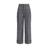 Brunello Cucinelli’s Prince of Wales patterned pants interpret classic elegance with a modern cut. The front zip-and-hook closure and belt loops at the waist ensure a tailored fit, while side and back welt pockets add functionality. The turn-up at the bottom and cropped wide leg give the garment a contemporary touch, perfect for a sophisticated yet casual style.
