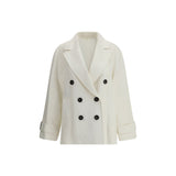 Brunello Cucinelli’s double-breasted jacket features classic lapels and a double-breasted button closure that gives an elegant, structured look. The two side welt pockets add a touch of practicality, while the adjustable sleeves with buckle offer a customizable fit. A sophisticated and versatile garment perfect for creating refined and contemporary looks.