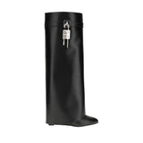 Givenchy’s Shark Lock Boots strike a perfect balance between contemporary elegance and bold sophistication. Crafted from fine smooth calfskin, the wide-cut tube style wraps the leg with a bold and sophisticated design. The leather band with metal closure, embellished with 4G Lock in silver finish on the right side and GIVENCHY metal lock with gold and silver finish on the left side, lends a distinctive and luxurious touch. The almond toe and covered wedge heel complete the look with elegance while offering comfort and stability.