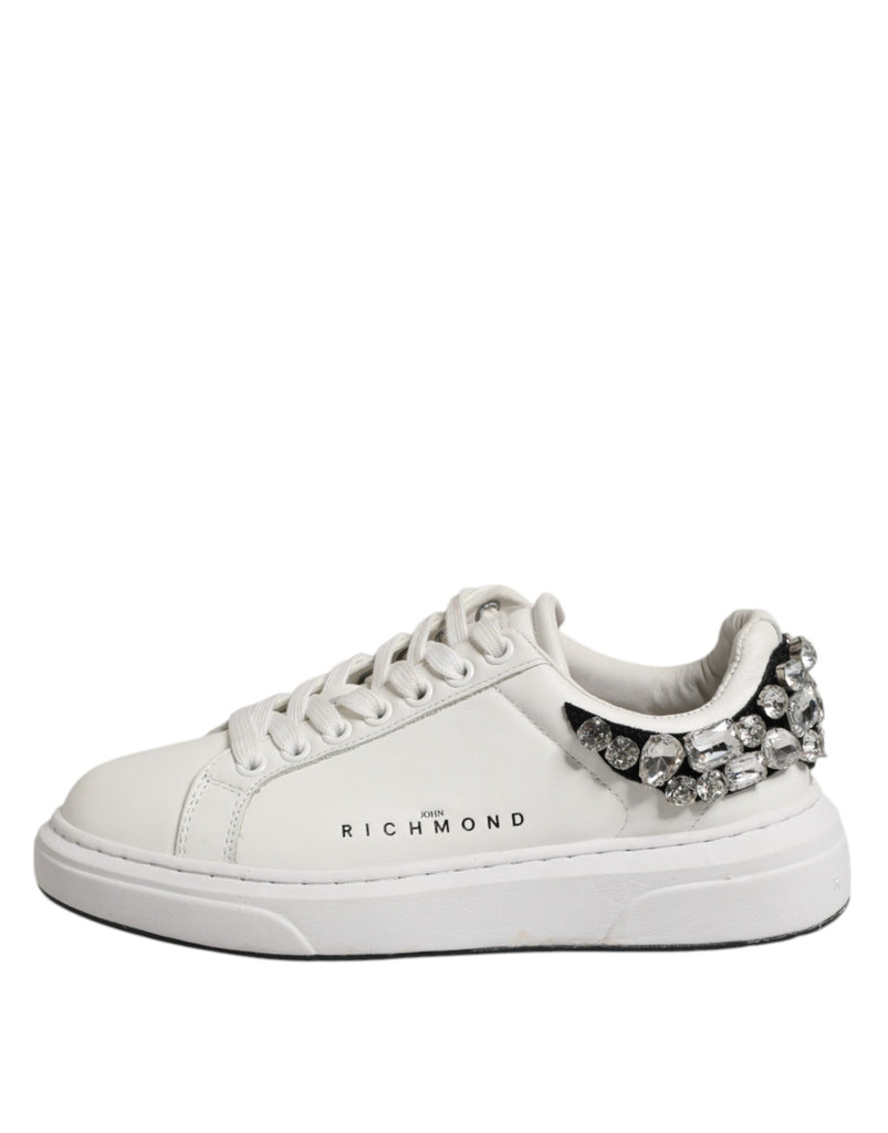 Gorgeous preowned, 100% Authentic JOHN RICHMOND white leather upper is accented with sparkling rhinestones, making them the perfect choice for adding some glamour to your athletic shoes collection. The cushioned insole provides ultimate comfort, making them perfect for walking, tennis, or even cheerleading.
