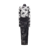 The Tessa sheer Lace Jumpsuit by The Andamane is a bold, sensual piece that plays with structure and contrast. Featuring a turtleneck with an open back, it comes with long sleeves and a knotted drape detail at the waist that enhances the silhouette. Hidden beneath the flowing maxi skirt with a dramatic slit are full-length leggings, adding an unexpected modern twist. A button closure secures the turtleneck in place, completing a refined and striking design.