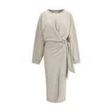 The Sandrina Dress by Marant Étoile reinterprets casual style with a feminine and contemporary twist. Crafted from solid-color cotton jersey, it features a round neckline, long sleeves with dropped armholes, and ribbed trims on the neckline and cuffs. The silhouette is distinguished by the wrap skirt tied at the waist, which creates a natural drape and flatters the figure. The embroidered “Marant” logo on the back adds an iconic detail. This long dress has a relaxed fit yet is fitted at the waist, perfect for a casual and polished look.