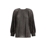 Missoni’s Striped sequined Blouse is a feminine and sophisticated piece, featuring a simple crew neck and balloon sleeves that give it volume and movement. The raw-cut hem adds a modern detail, while sequins embellish the striped pattern with a touch of refined flare.