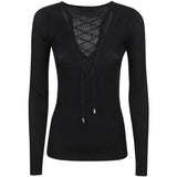 Pinko ribbed sweater in metallic fiber, V-neck with crossed drawstring, tight fit