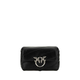 Calfskin Love Baby Shoulder Bag by Pinko, front closure with magnetic button, iconic gold-plated Love Birds logo embossed on the front, quilted and padded design, double internal compartment, sliding chain shoulder strap, iconic brand monogram embroidered tone-on-tone on the back.