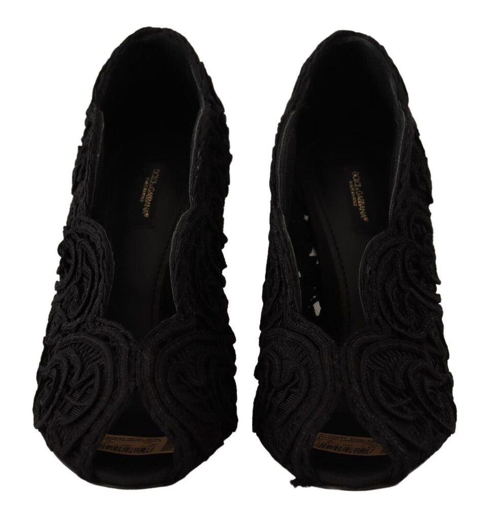 Gorgeous brand new with tags 100% Authentic Dolce & Gabbana Black Bette shoes with a high stiletto heel, an open toe and a figured neckline sewn from openwork cord Ricamo.