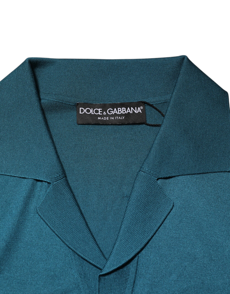 Gorgeous brand new, 100% Authentic Dolce & Gabbana short-sleeve polo shirt, expertly crafted in Italy from 100% pure silk. This finely knit shirt features a clean teal blue hue, a sleek Johnny collar, and a soft, breathable finish—perfect for smart-casual styling.
