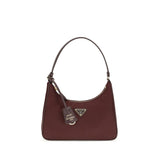 Re-nylon Shoulder Bag by Prada, made of black recycled nylon, combines sustainability and contemporary style. Featuring silver-tone hardware, it features a zipper closure, leather handle and logo fabric-lined interior. The enameled metal triangle logo signs the design, complemented by a practical removable key ring with matching leather pouch. A functional and refined accessory perfect for everyday use.