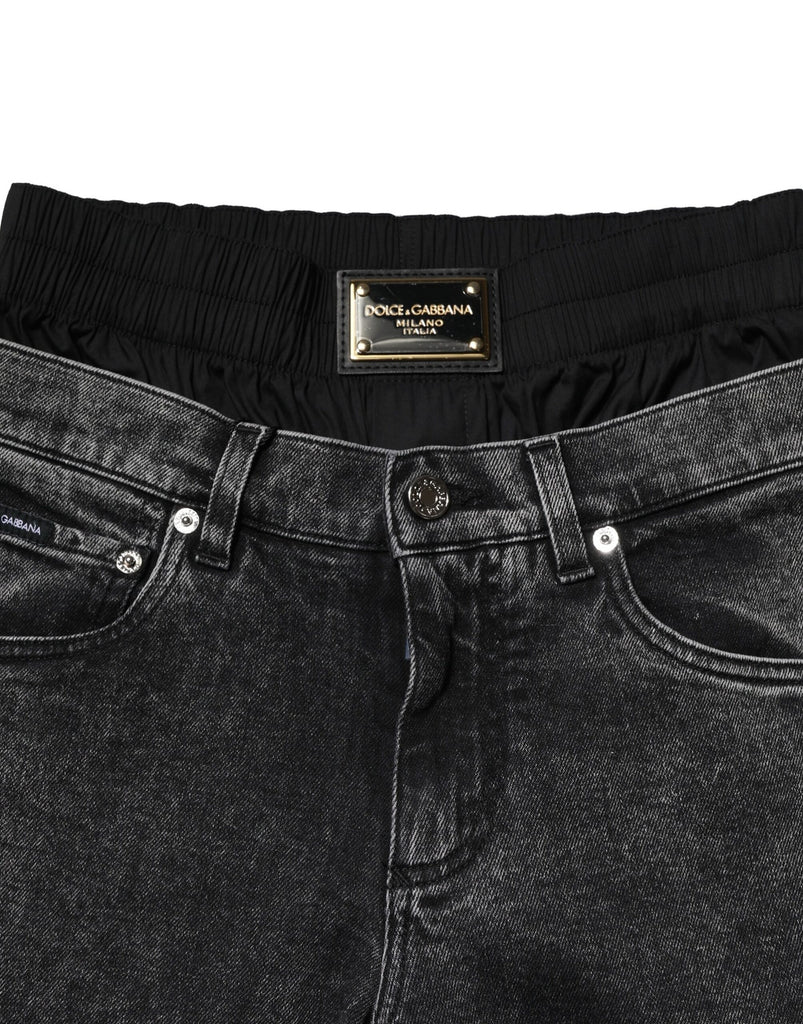 Gorgeous brand new, 100% Authentic Dolce & Gabbana jeans in a black wash. These jeans feature a double waistband, with a black elasticated section above the standard denim waistband, and a logo plaque on the back.