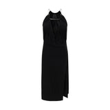 Givenchy’s midi Dress is an elegant and bold piece with a design that enhances femininity. Its halter neckline is embellished with a chain, while the cut-out detail on the front and deep V-neck add a sensual touch. The midi length and wide front slit lend a fluid movement to the look. The sleeveless pattern and double-breasted design with drape on the front complete the look, creating a sophisticated and dynamic silhouette perfect for special occasions.