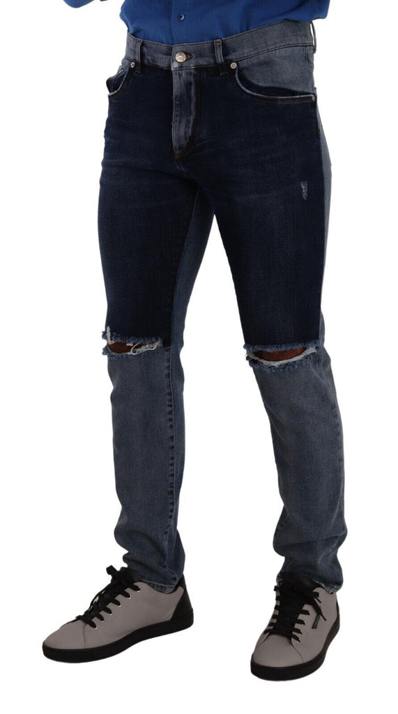 Dolce & Gabbana Blue Two Tone Tattered Cotton Slim Denim Jeans