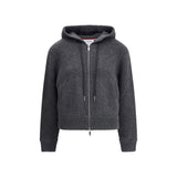 Wool Sweatshirt by Thom Browne with adjustable drawstring hood and ribbed hem. The style features a double-slider front zipper closure, two side welt pockets, and ribbed cuffs and hem for a comfortable fit and a refined design.
