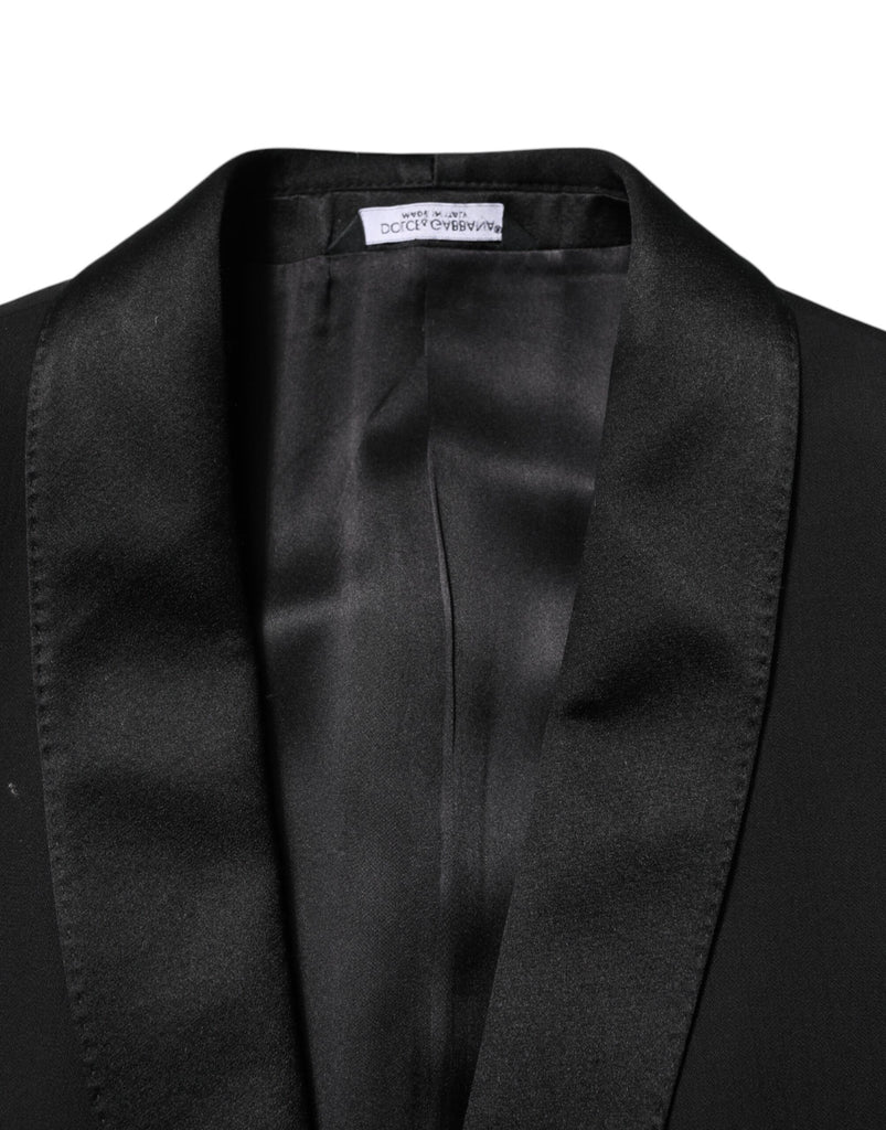 Gorgeous brand new, 100% Authentic Dolce & Gabbana black, three pieces suit is crafted from a virgin wool blend and features a jacket with a shawl lapel, long sleeves, a chest pocket, side flap pockets and button cuffs. The trousers feature a mid rise, a button and zip fly, a waistband with belt loops, side pockets, back pockets and a regular length.
