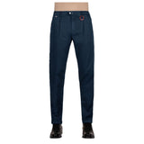 Tramarossa Alberto chino trousers in slightly stretch dark blue cotton, button and zip fastening, two side welt pockets and two back pockets, suede patch on the back.