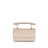 The Valentino Garavani small Leather Rockstud Spike Handbag is a bold and elegant style icon, perfect for adding a touch of glamour to any look. Crafted from high-quality leather, this bag features a timeless design enhanced by all-over appliqué studs that give it a distinctive rock-chic look. The flat studded shoulder strap adds a touch of character, while the front swivel and flap closure provides security and convenience. Removable chain shoulder strap. Single compartment interior provides ample space for essentials while maintaining a clean, functional design.