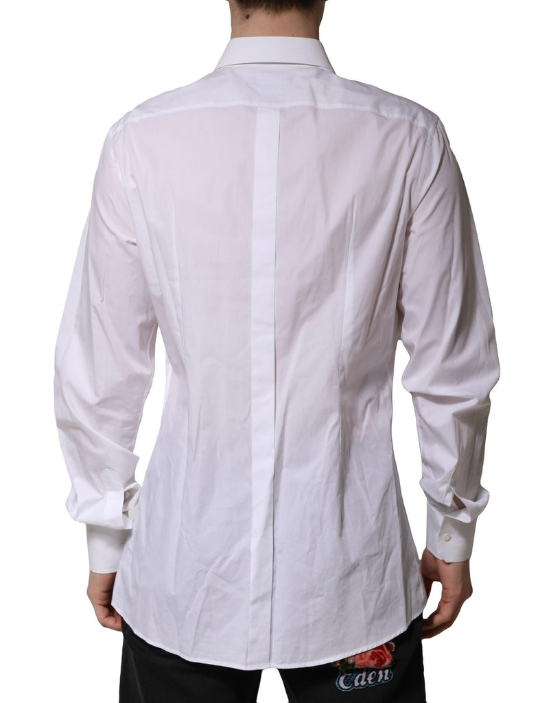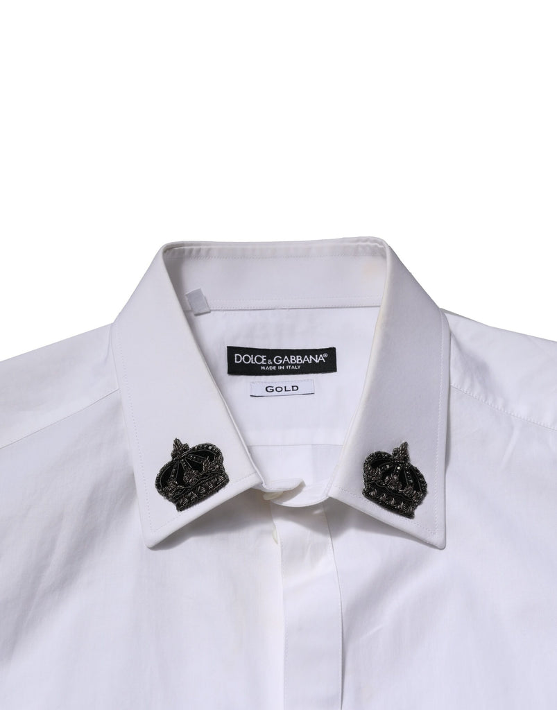 Gorgeous brand new, 100% Authentic DOLCE & GABBANA men’s dress shirt, crafted in Italy from 100% cotton. A standout feature is the embroidered crown patches on the collar tips—part of the exclusive GOLD label, known for its luxury detailing and craftsmanship.