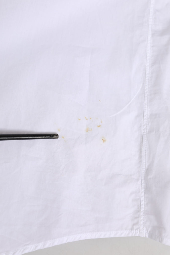 This item has a minor defect, there is a stains around the collar buttonhole, marks on the lower back, and discoloration on the cuff (see pictures for details).